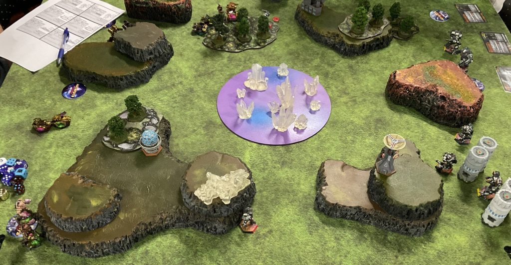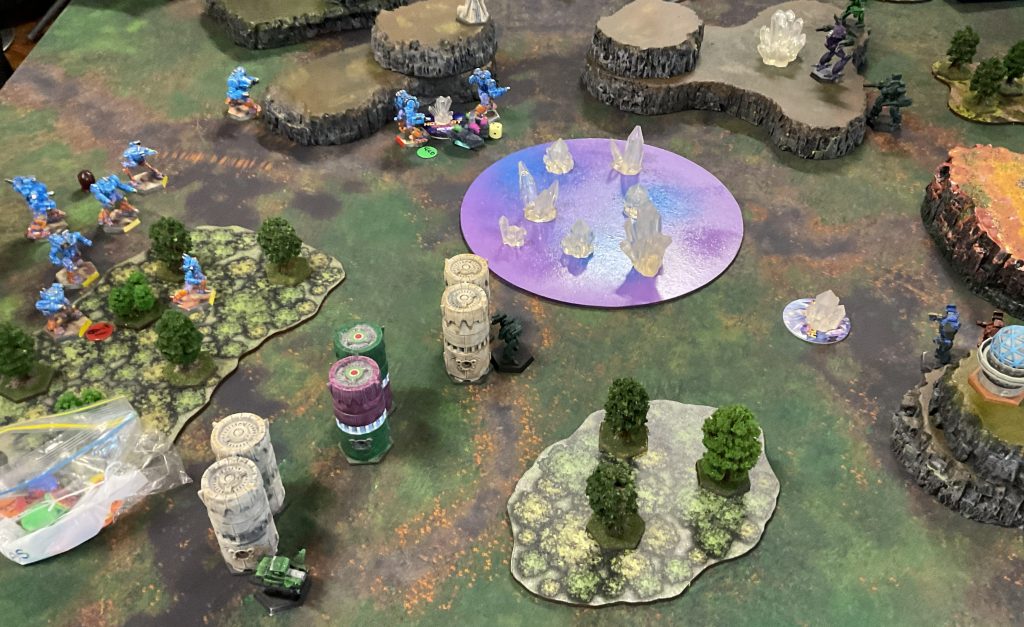 So yes… This scenario’s design started as a bit of humour (re: Starcraft video game), but on playing it it was a viable building focused scenario. Building focused scenarios are difficult to create, but I persist and this one seemed to work. Some players went hard on taking out the crystal pylons and others chose instead to fight a fixed battle mid field while the pylons built up.