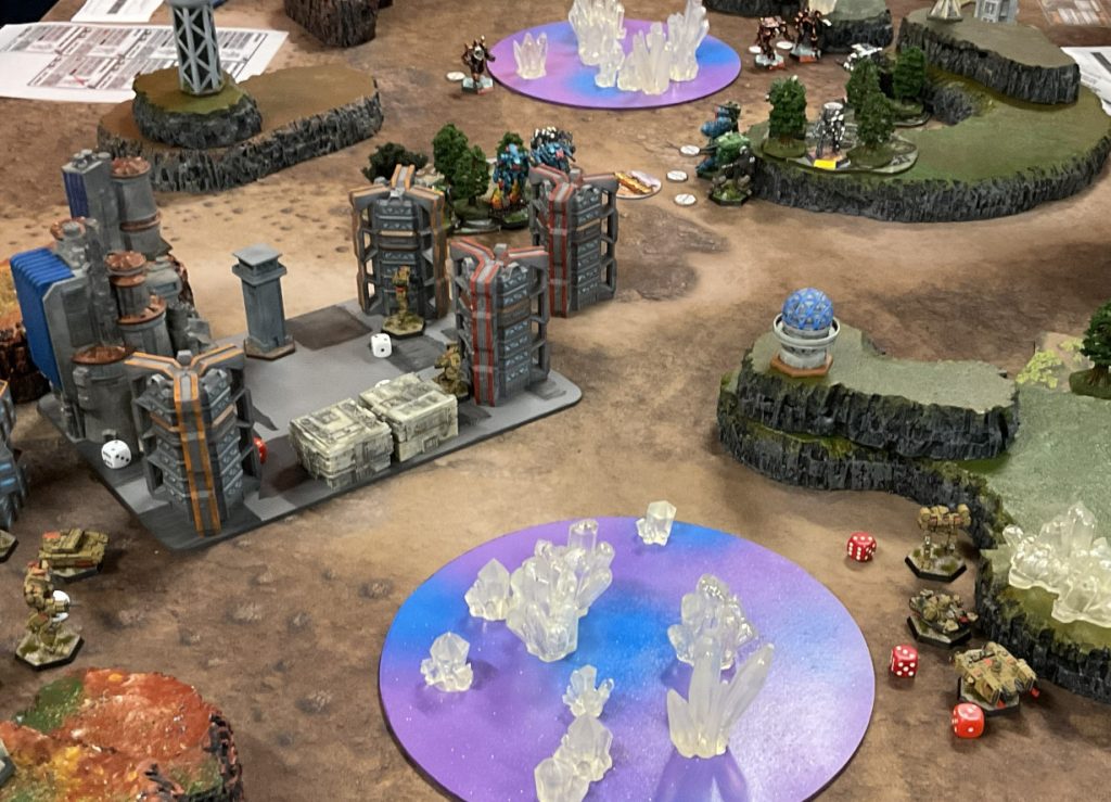 On the day we had four scenarios connected in a narrative around mysterious crystalline formations found on the planet Matteo in the Battletech universe. This gave us the opportunity to build a narrative around the missions as well as have some fun creating terrain that created a different visual on the day.